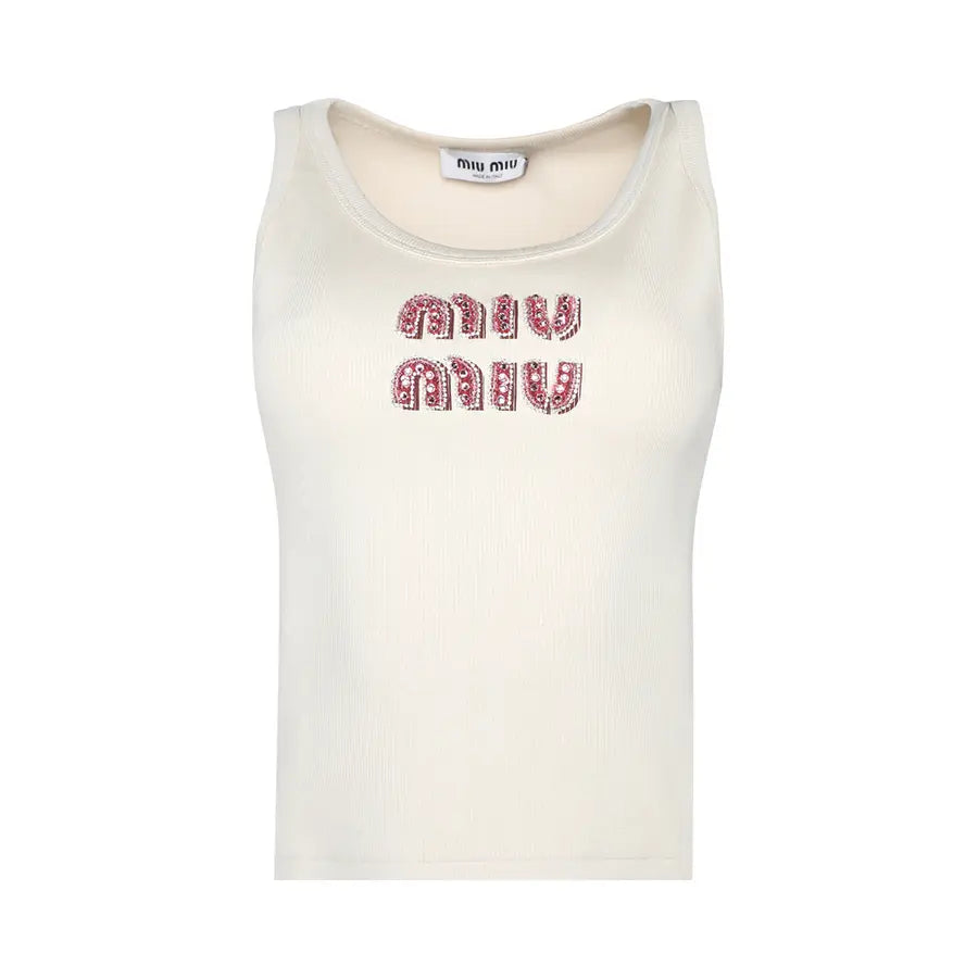 It is a sleeveless, fitted top made from a ribbed fabric with a round neckline. On the front, it features the Miu Miu logo embellished in sparkling pink rhinestones, giving it a stylish and feminine touch. The design is minimalistic yet chic, making it versatile for both casual and elevated outfits.